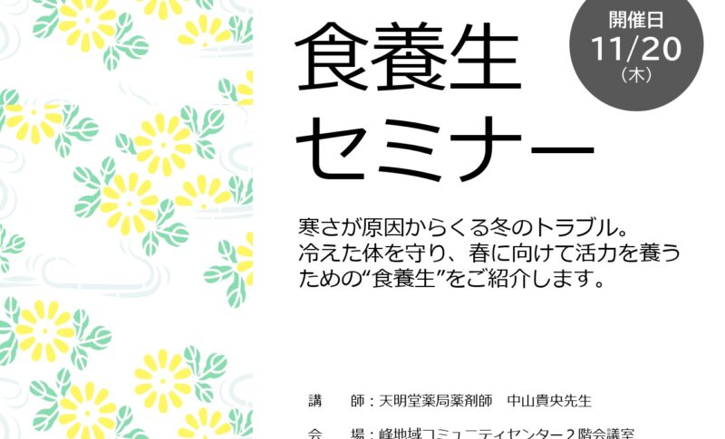 11/20(木)峰セミナー「冬の食養生セミナー」を開催しました。 冬に起こりやすい不調の原因とそれを防ぐ2つのキーポイントについてなど、お話し頂きました。 とても濃い内容で、皆さん熱心にメモを取りながら聞いていました。