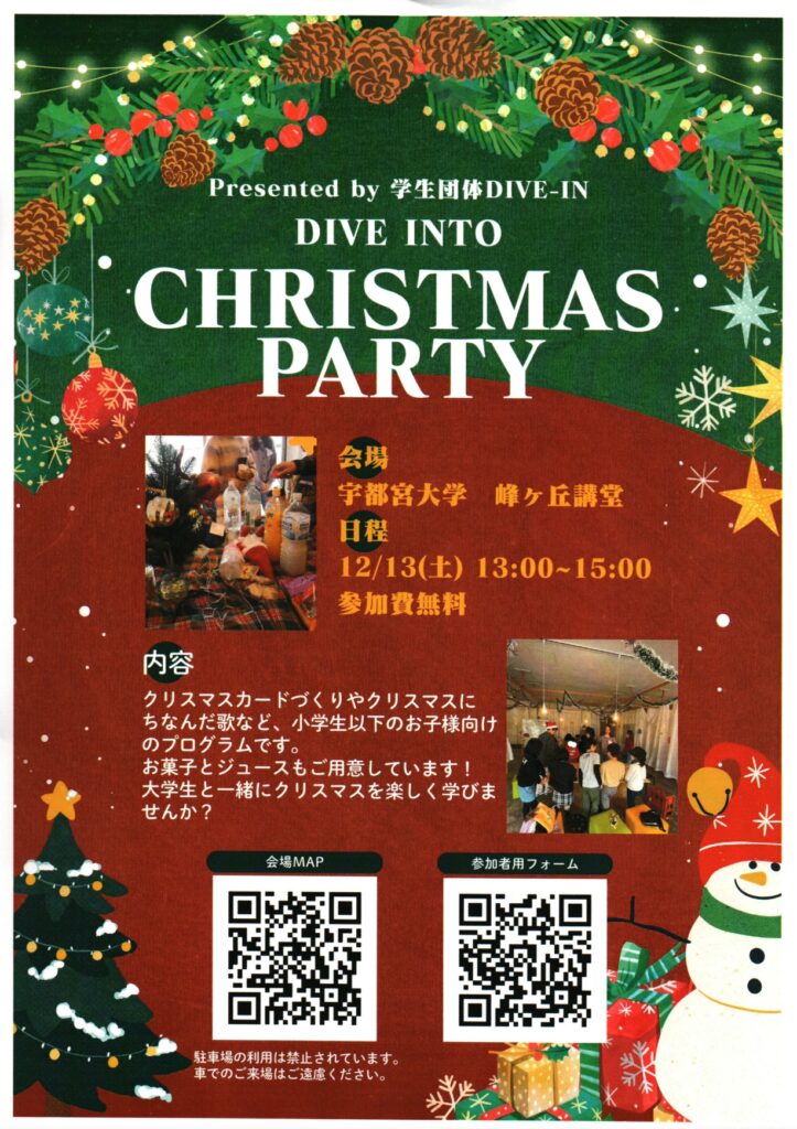 12月13(土)に宇都宮大学峰ヶ丘講堂で、クリスマスのイベントが行われます。小学生以下のお子さん、ぜひどうぞ~!
