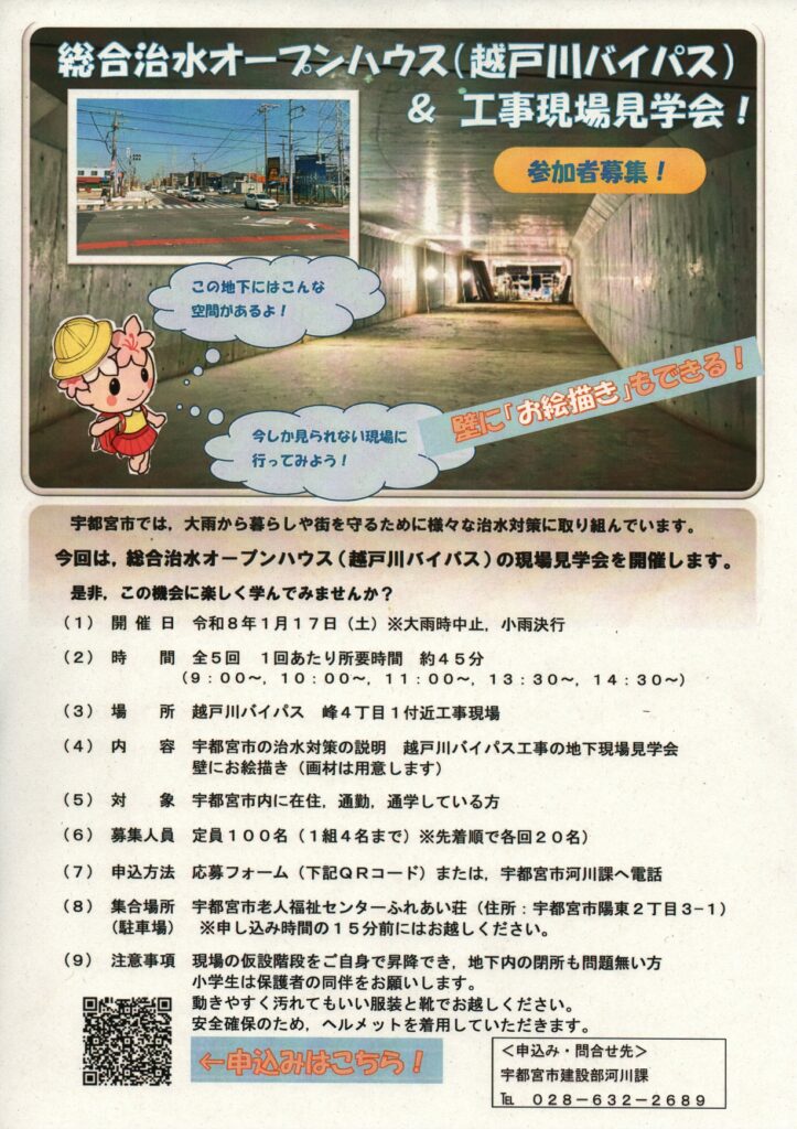 令和8年1月17日(土)に総合治水オープンハウス(超戸川バイパス)の現場見学会が開かれます。参加希望の方は、応募フォームまたは宇都宮市河川課までお申込みください。